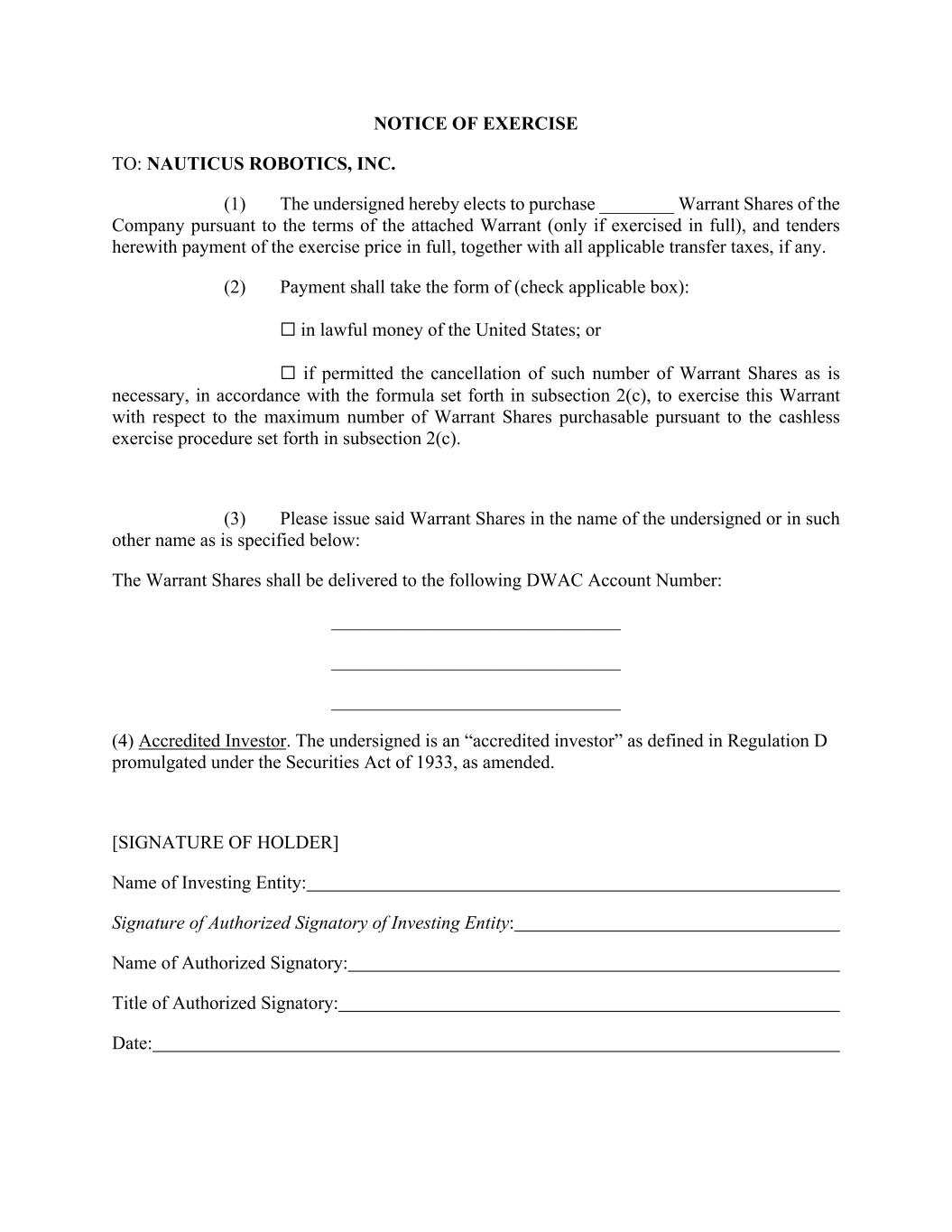 NOTICE OF EXERCISE TO: NAUTICUS ROBOTICS, INC. (1) The undersigned hereby elects to purchase ________ Warrant Shares of the Company pursuant to the terms of the attached Warrant (only if exercised in full), and tenders herewith payment of the exercise price in full, together with all applicable transfer taxes, if any. (2) Payment shall take the form of (check applicable box): ☐ in lawful money of the United States; or ☐ if permitted the cancellation of such number of Warrant Shares as is necessary, in accordance with the formula set forth in subsection 2(c), to exercise this Warrant with respect to the maximum number of Warrant Shares purchasable pursuant to the cashless exercise procedure set forth in subsection 2(c). (3) Please issue said Warrant Shares in the name of the undersigned or in such other name as is specified below: The Warrant Shares shall be delivered to the following DWAC Account Number: _______________________________ _______________________________ _______________________________ (4) Accredited Investor. The undersigned is an “accredited investor” as defined in Regulation D promulgated under the Securities Act of 1933, as amended. [SIGNATURE OF HOLDER] Name of Investing Entity: Signature of Authorized Signatory of Investing Entity: Name of Authorized Signatory: Title of Authorized Signatory: Date: