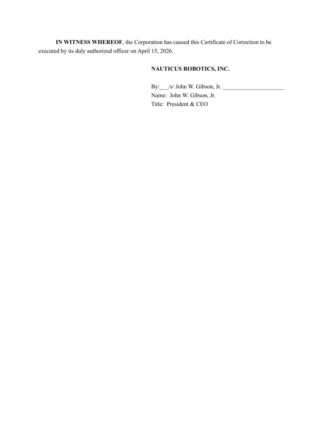 IN WITNESS WHEREOF, the Corporation has caused this Certificate of Correction to be executed by its duly authorized officer on April 15, 2026. NAUTICUS ROBOTICS, INC. By:___/s/ John W. Gibson, Jr. _____________________ Name: John W. Gibson, Jr. Title: President & CEO